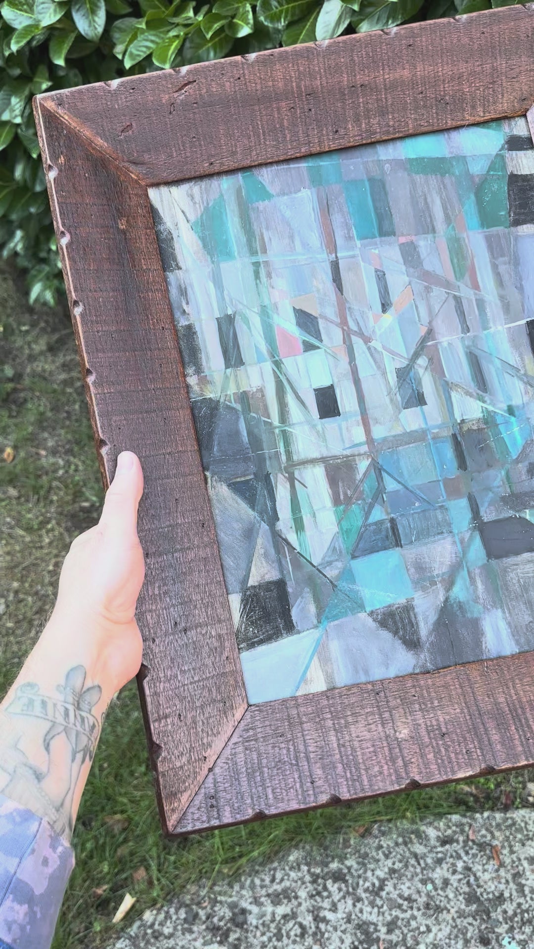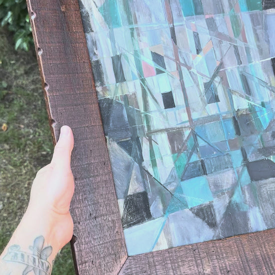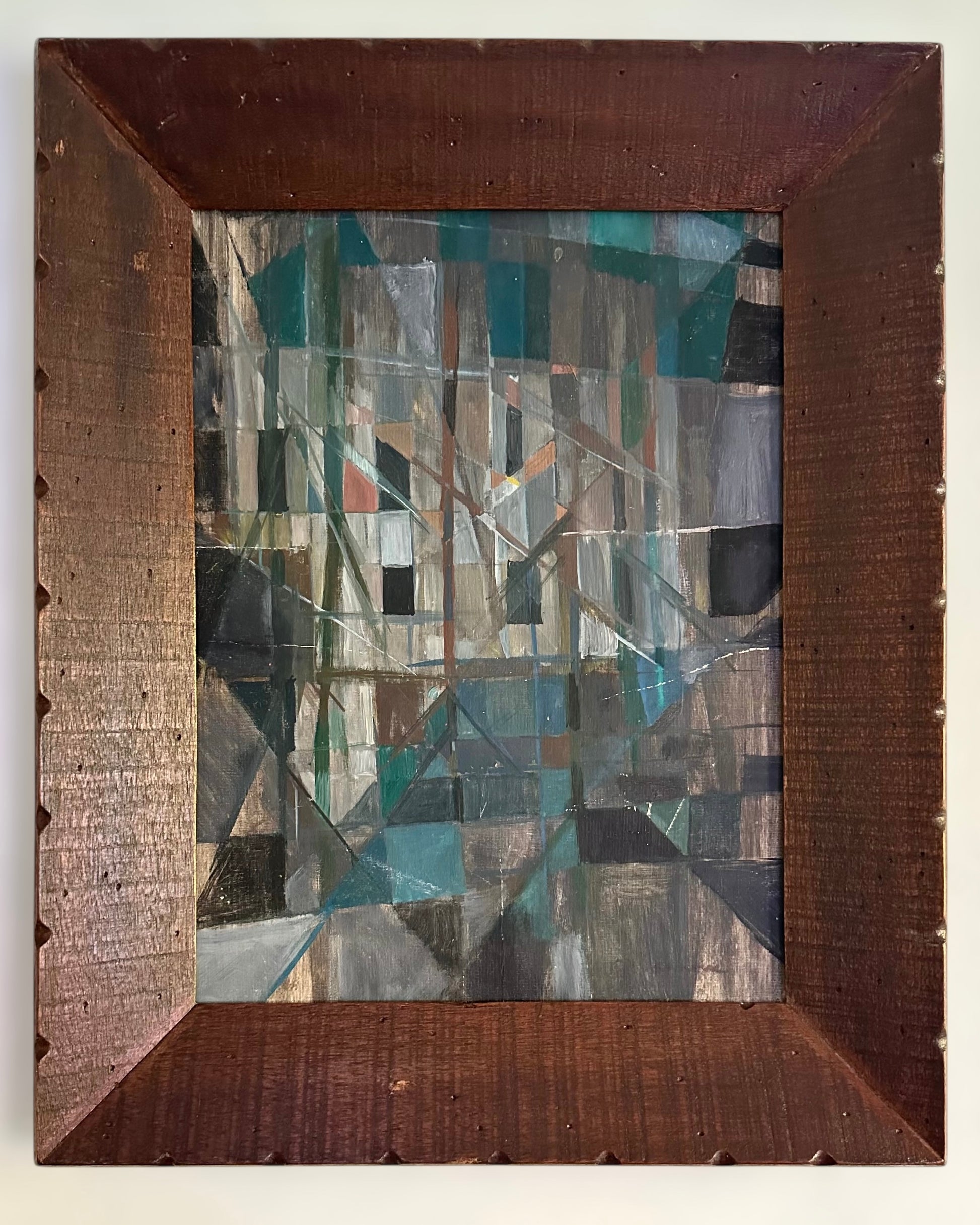 1950s Signed Geometric Abstract Oil on Artist Board, Wood Cove Frame