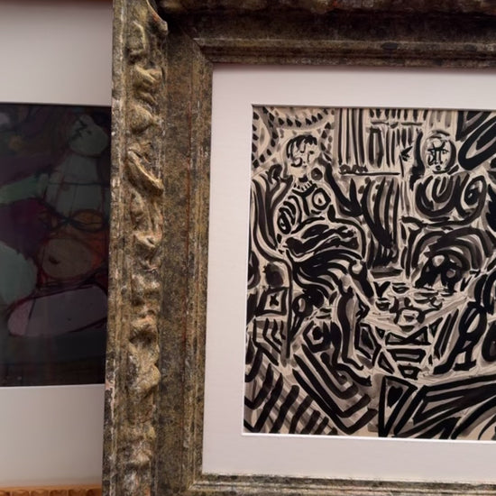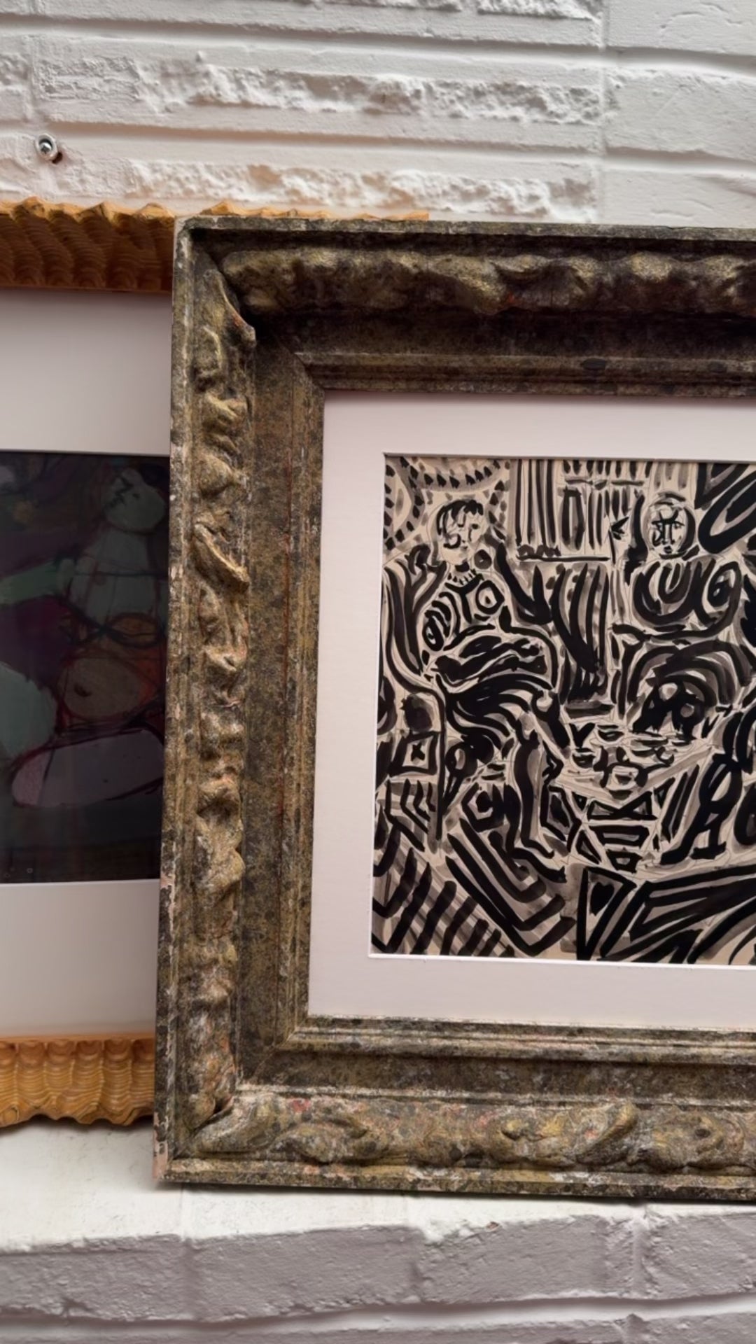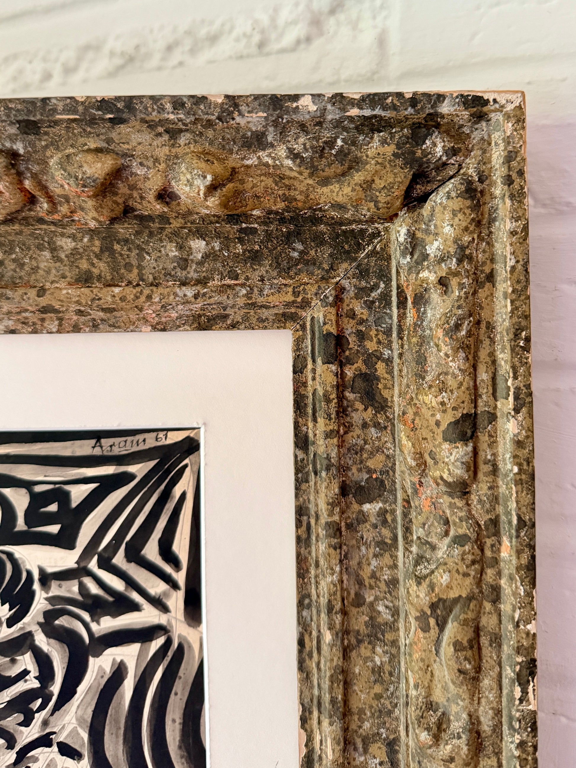 1961 ink on paper abstract drawing, signed, Vintage French frame