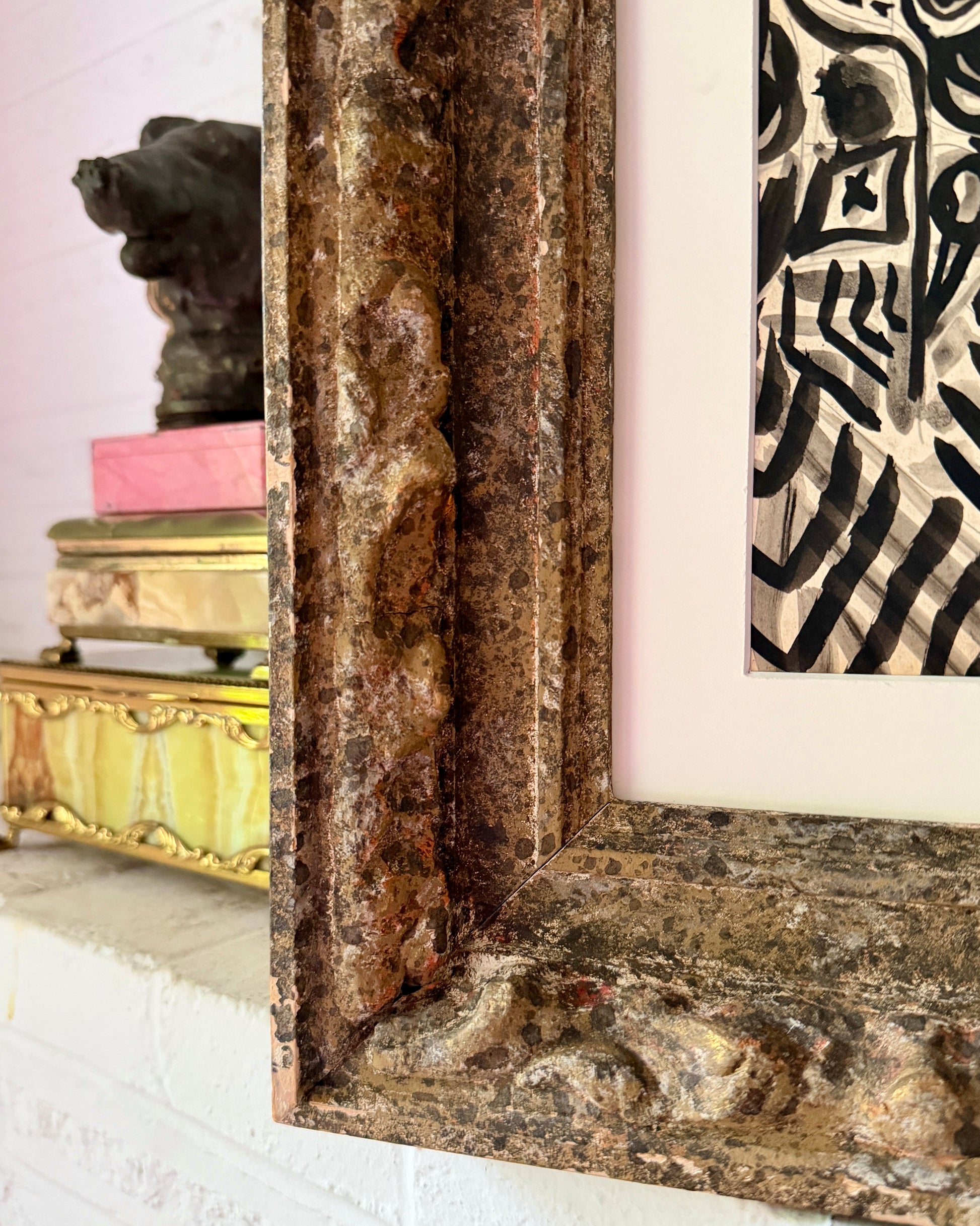 Beautifully executed ink on paper drawing signed and dated 1961. Presented behind glass in a vintage French wood frame with a distressed finish and ornate carving. Measures 19.5” x 17.5” and arrives ready to hang.