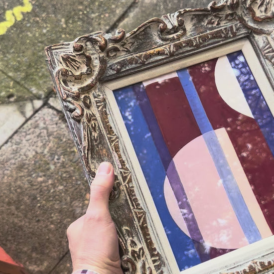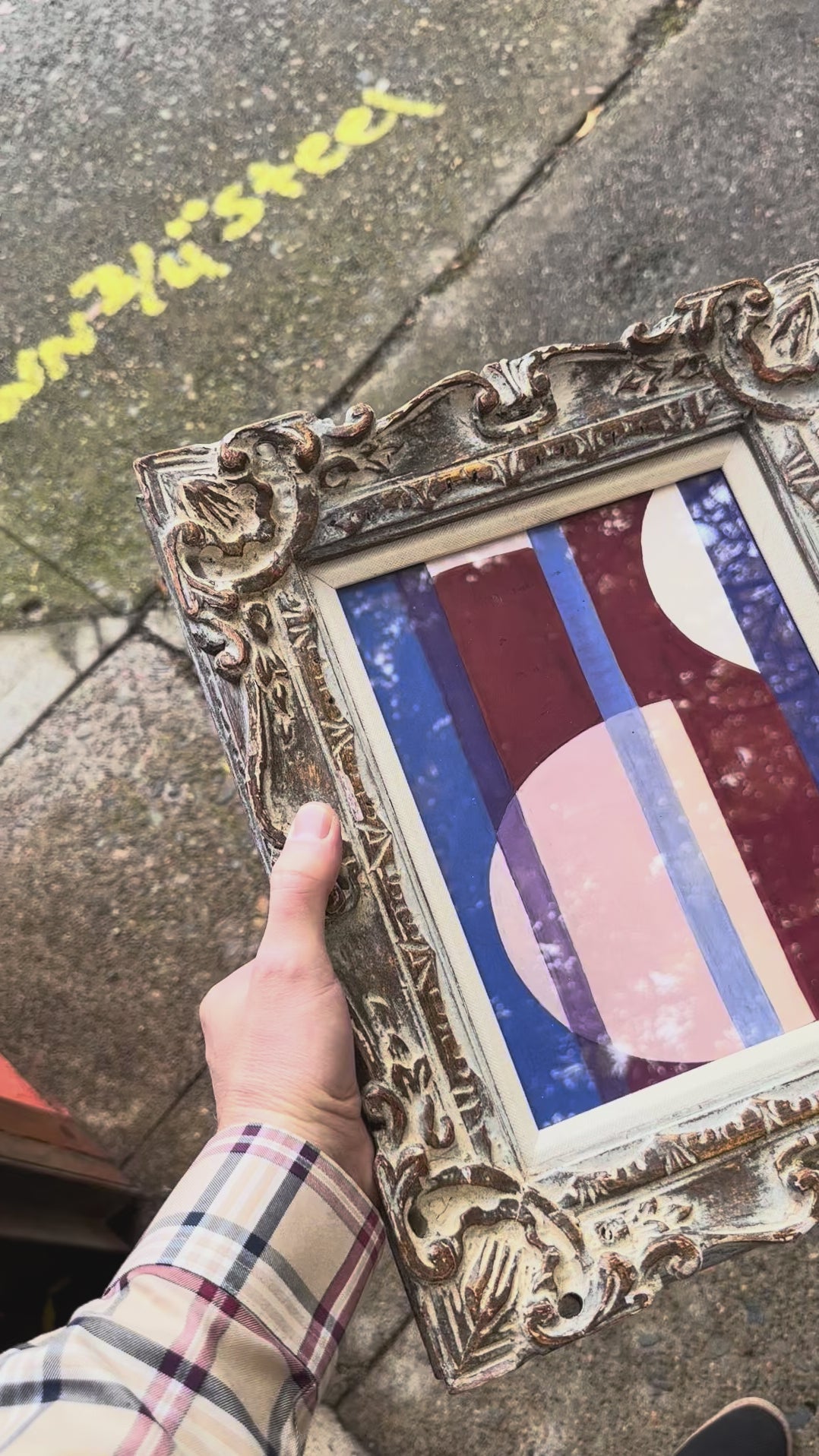 The piece has been paired with a vintage ornate carved wood frame and set behind glass. Excellent condition. 15” x 13” x 2” framed.