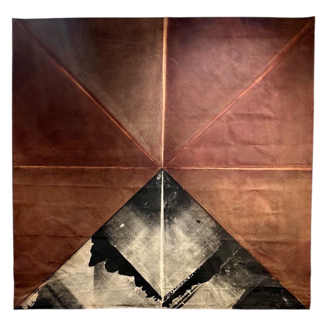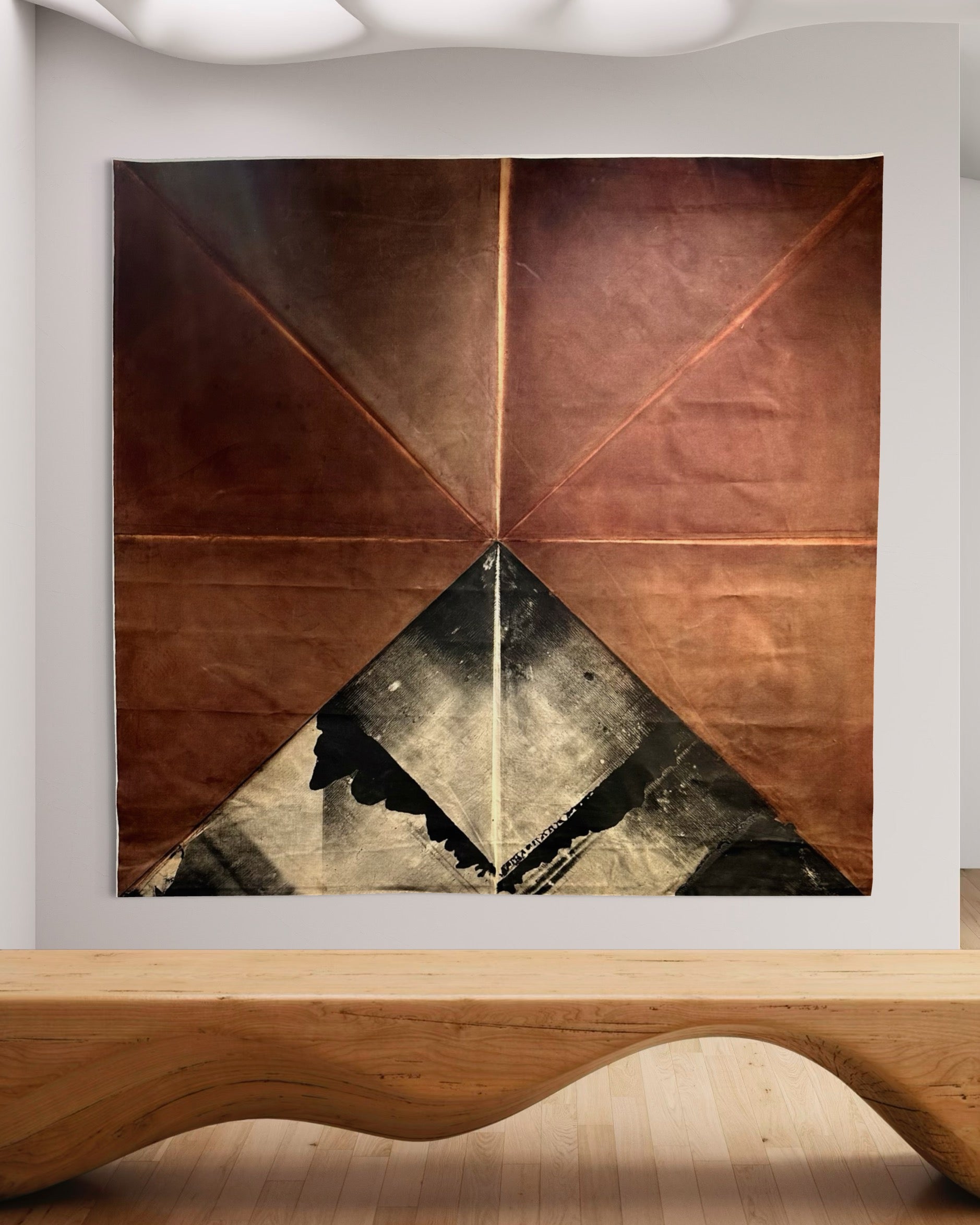 This is a large approx 80” x 84” abstract stain painting on heavy canvas, signed and dated 1977. The piece was produced with the intention of hanging like a tapestry, and top and bottom have adhered canvas loops that allow a wood slat or dowel to be attached, and then mounted to the wall.