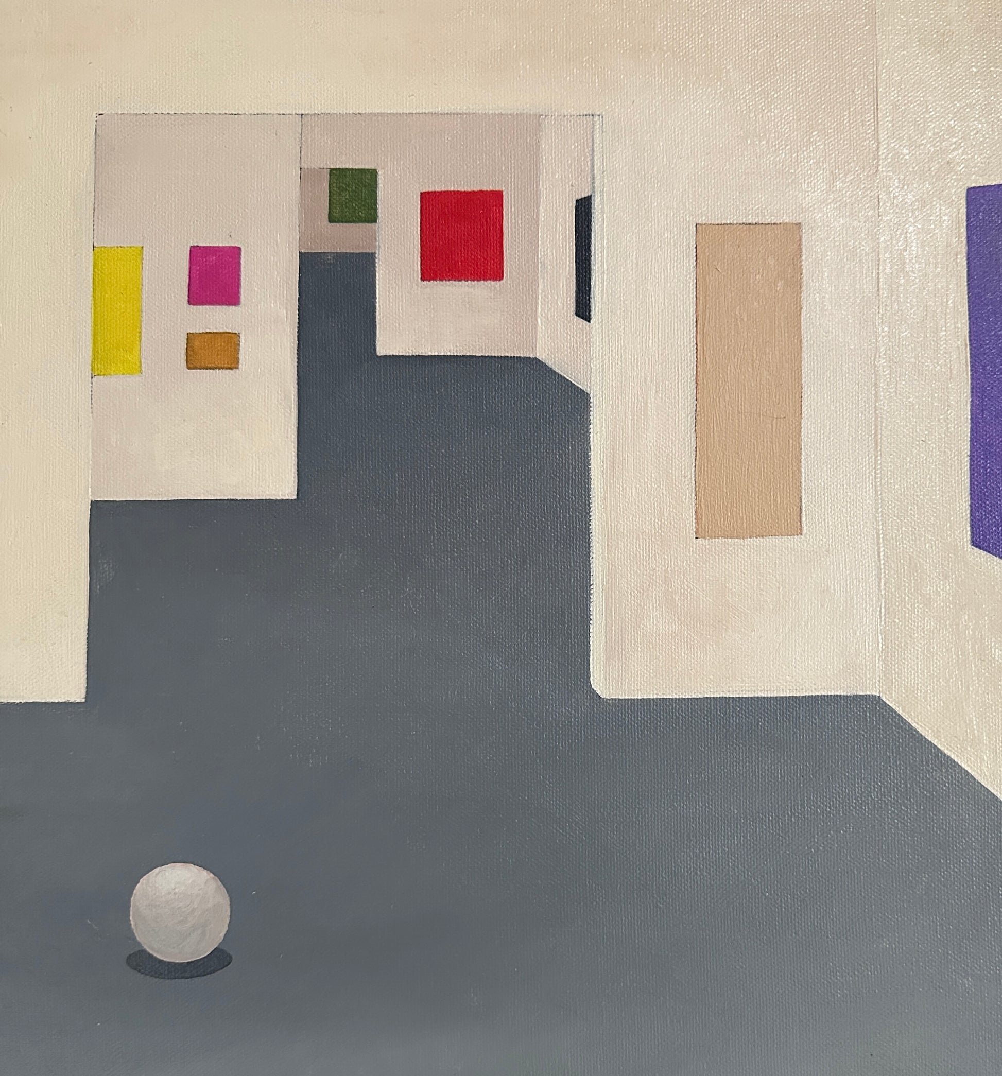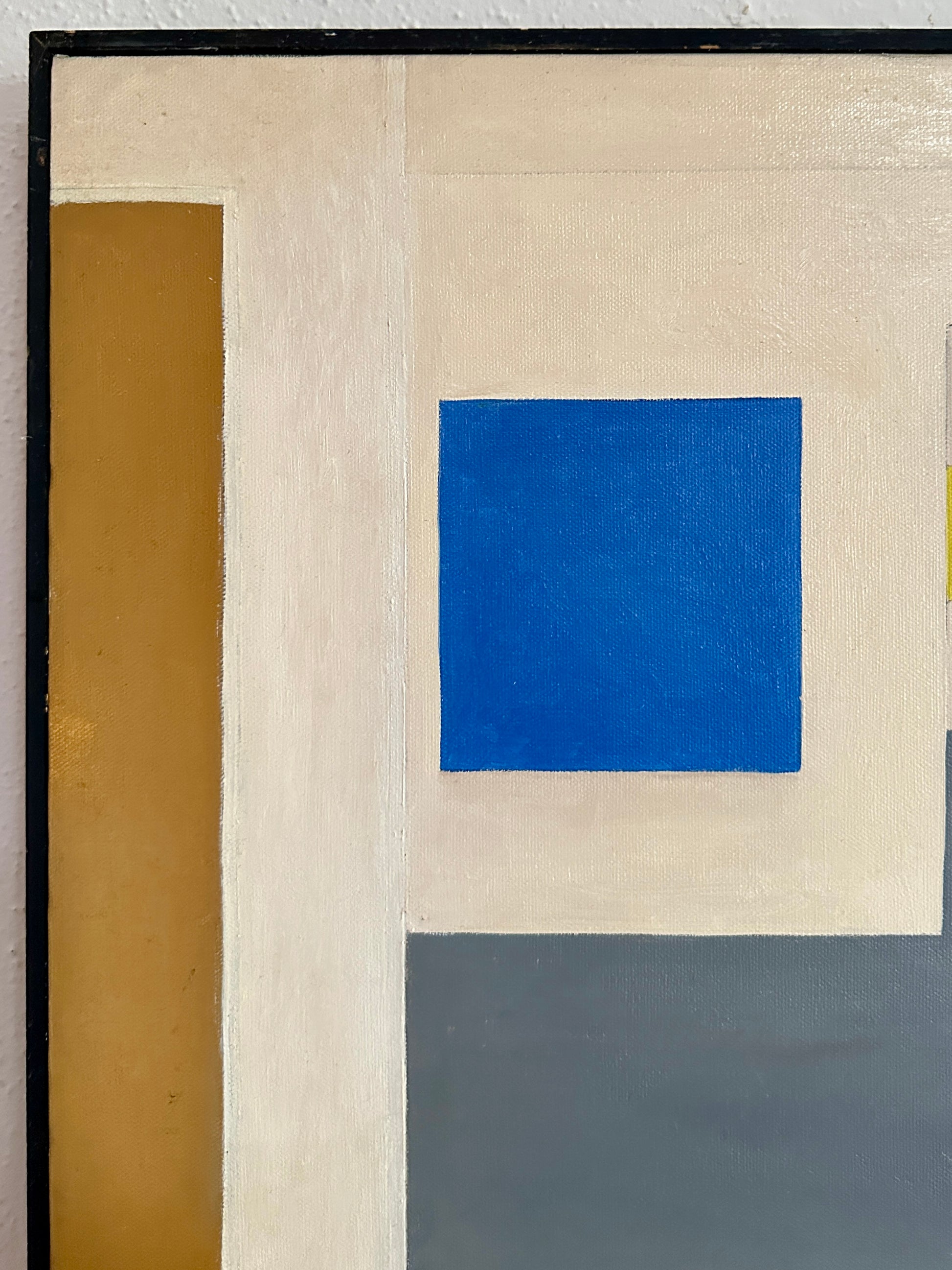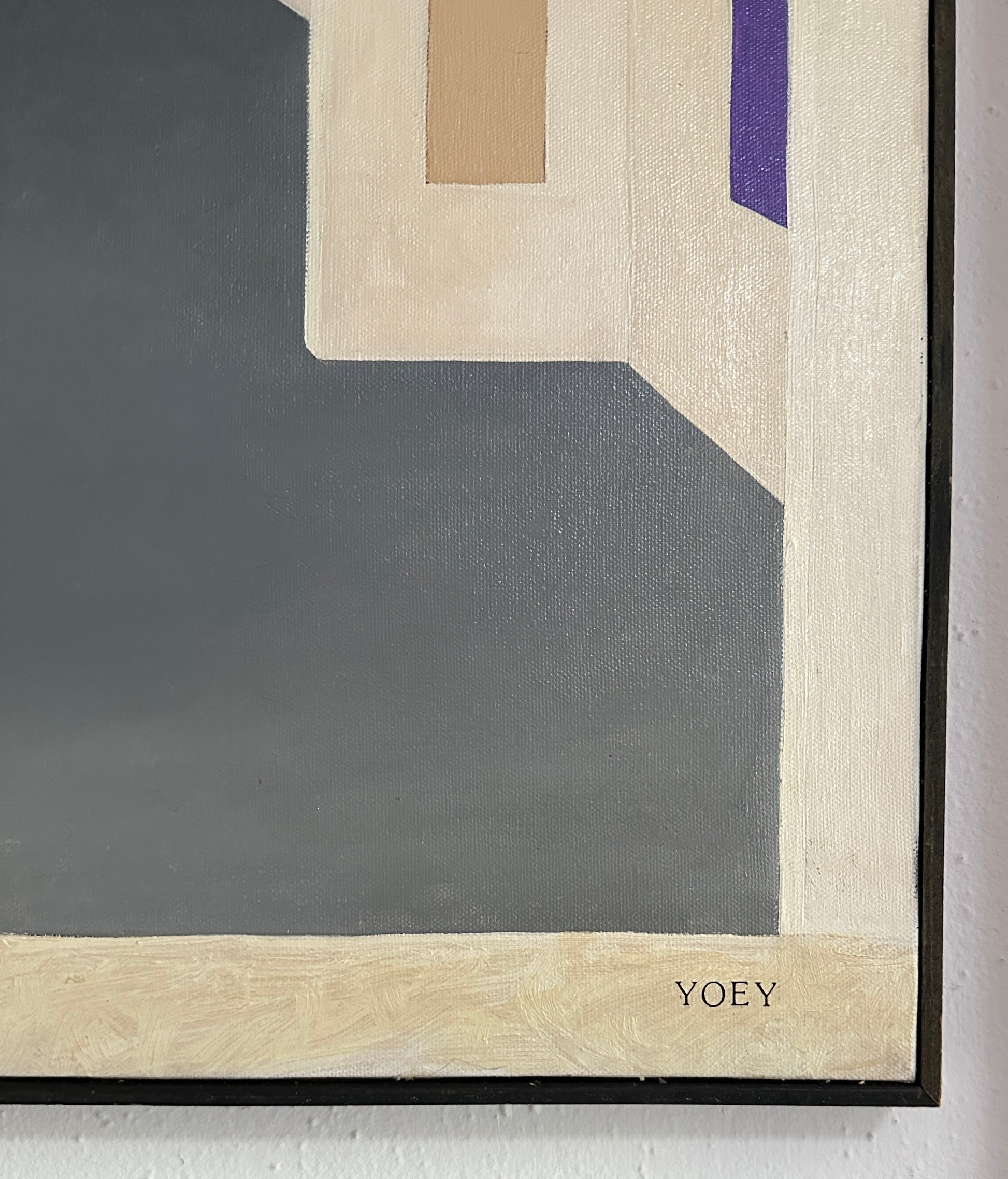 20th century oil on canvas painting of a gallery scene featuring abstract art, the words “art house of Odeon” and “Yeoy” ..possibly the artists name. A mystery of a painting acquired from a NYC estate