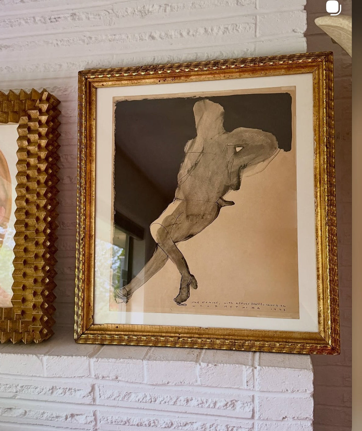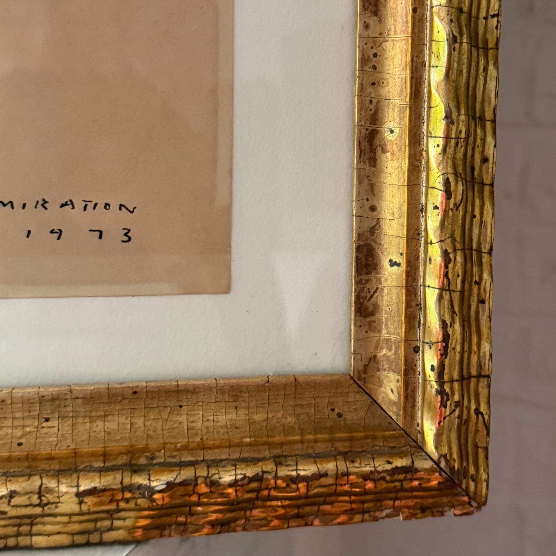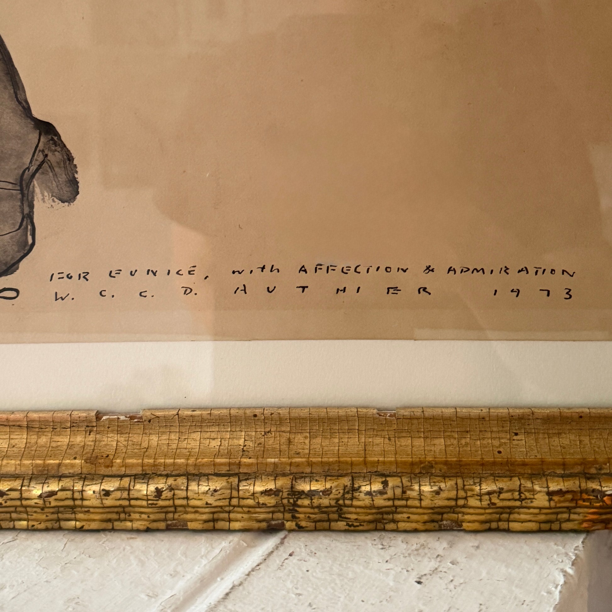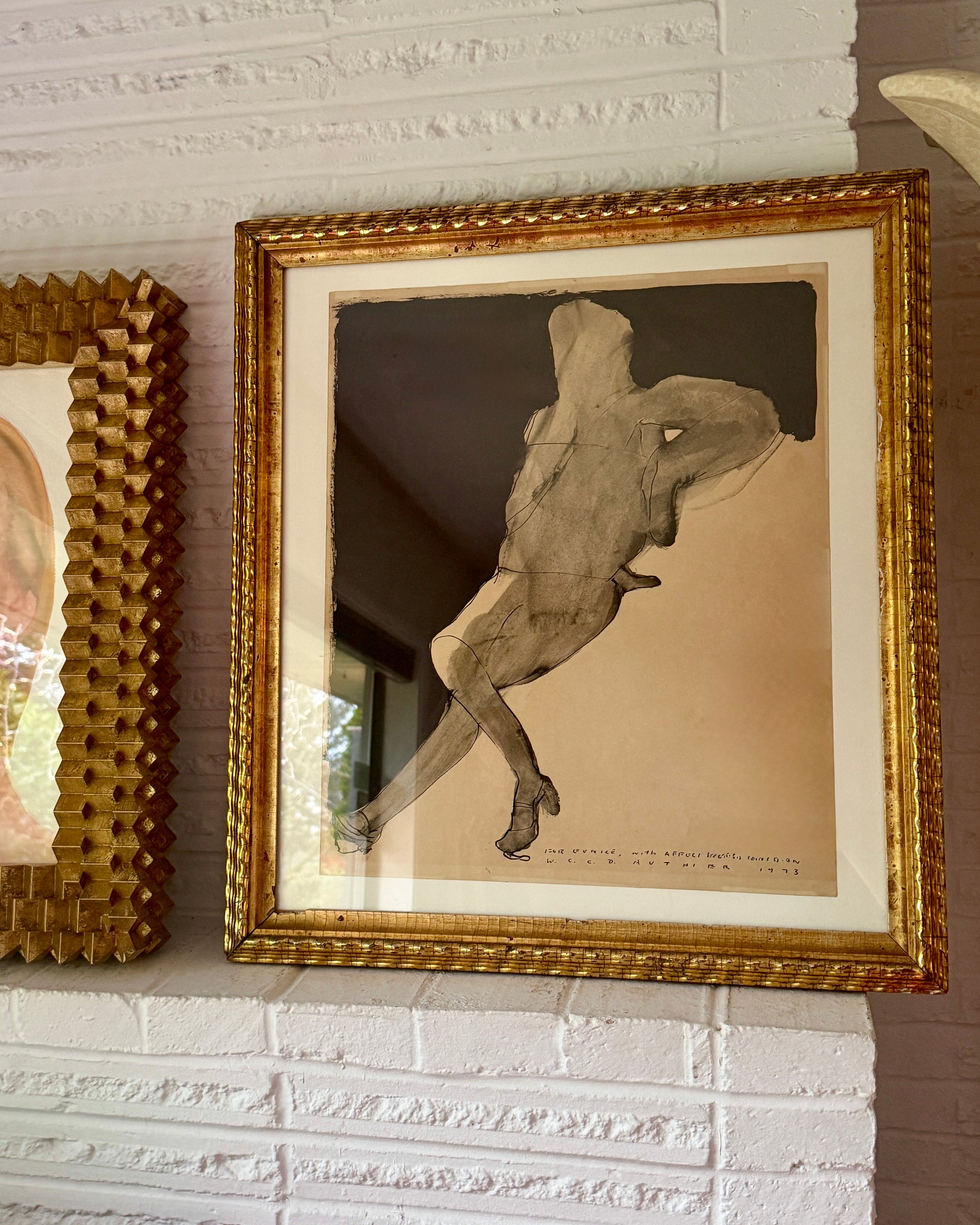 Ink on paper drawing executed in 1973 by the artist W.C.C.D Authier (1937-1988). This piece was given to the respected PNW artist Eunice Parsons (1916-2024) and was inscribed with a dedication to her and signed/dated. It has been mounted as a full sheet and presented behind glass in a scarce 19th century lemon gold gilt frame.